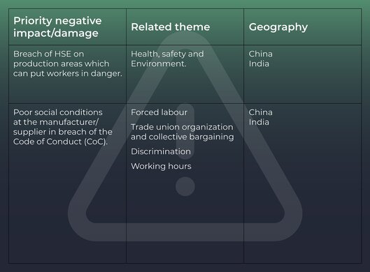 Vi är medvetna om att vissa områden kan vara mer sårbara för brott mot mänskliga rättigheter eller andra allvarliga utmaningar i samband med arbetsvillkor och modernt slaveri. Efter att ha genomfört en riskkartläggning och identifierat högriskområden vidtar vi ytterligare åtgärder för att kartlägga dessa risker mer ingående.